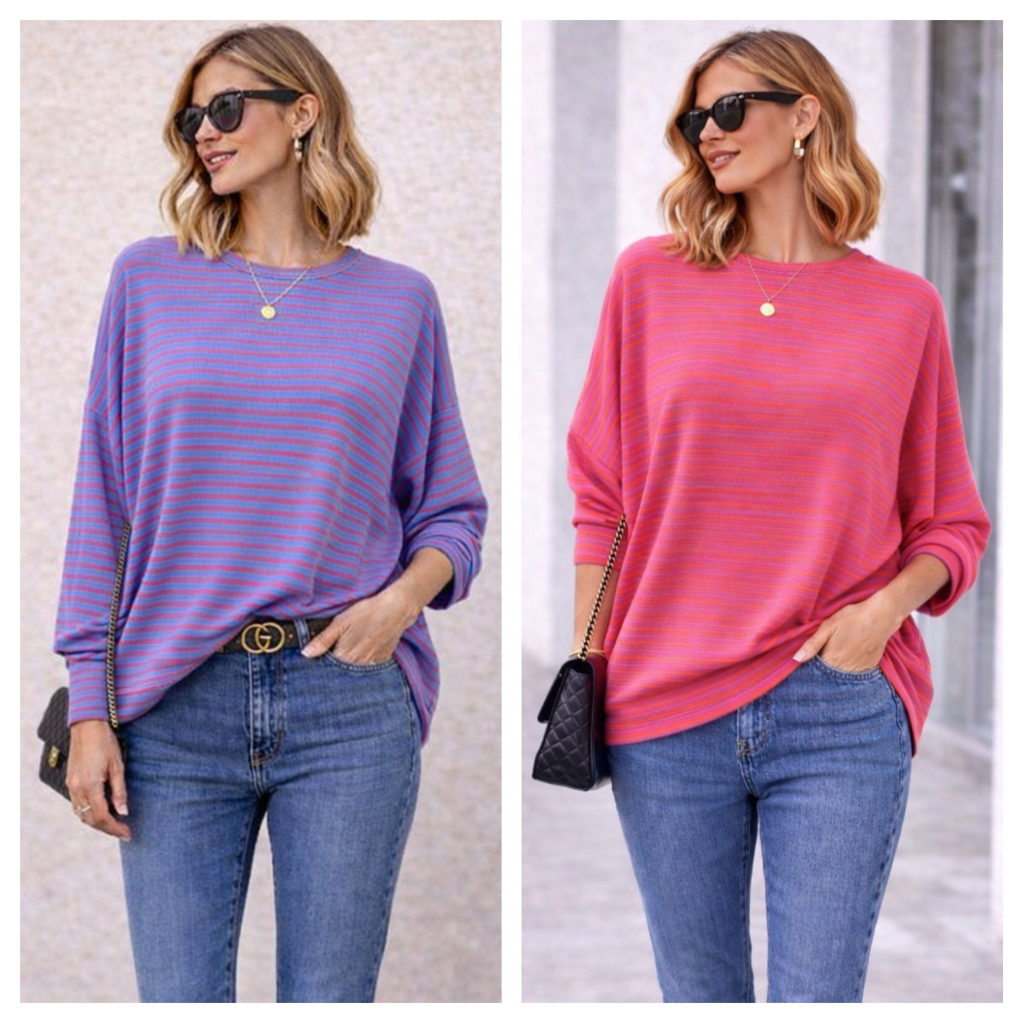 Spring stripes you’ll live in. This super soft knit is the perfect throw-on-and-go piece – lightweight, comfy and effortlessly chic. Available in these gorgeous colourways to brighten up your new season wardrobe. Sleeves batwing and cuffs