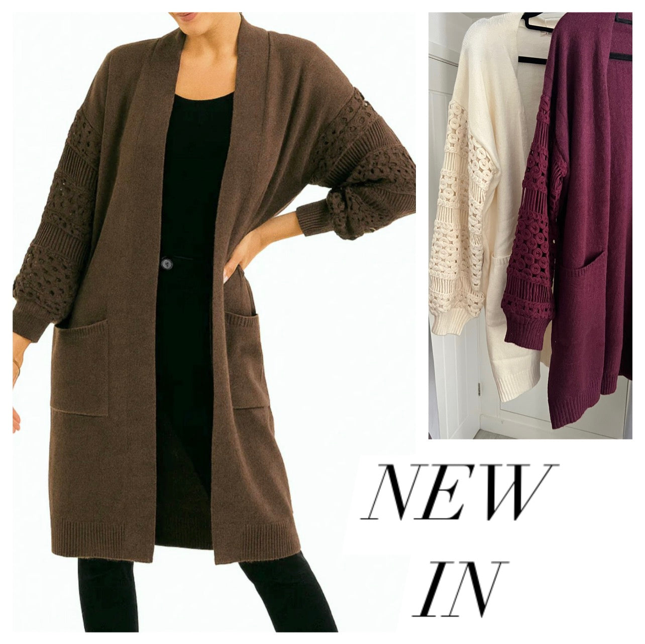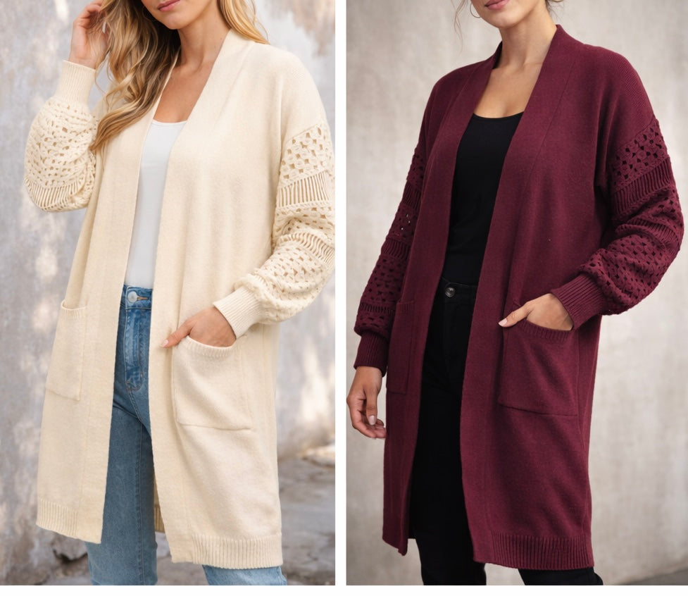 Gorgeous longline cardigans featuring crochet detail sleeves, two handy pockets – perfect for layering this season. Available in cream & burgundy