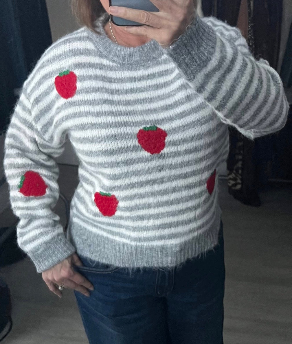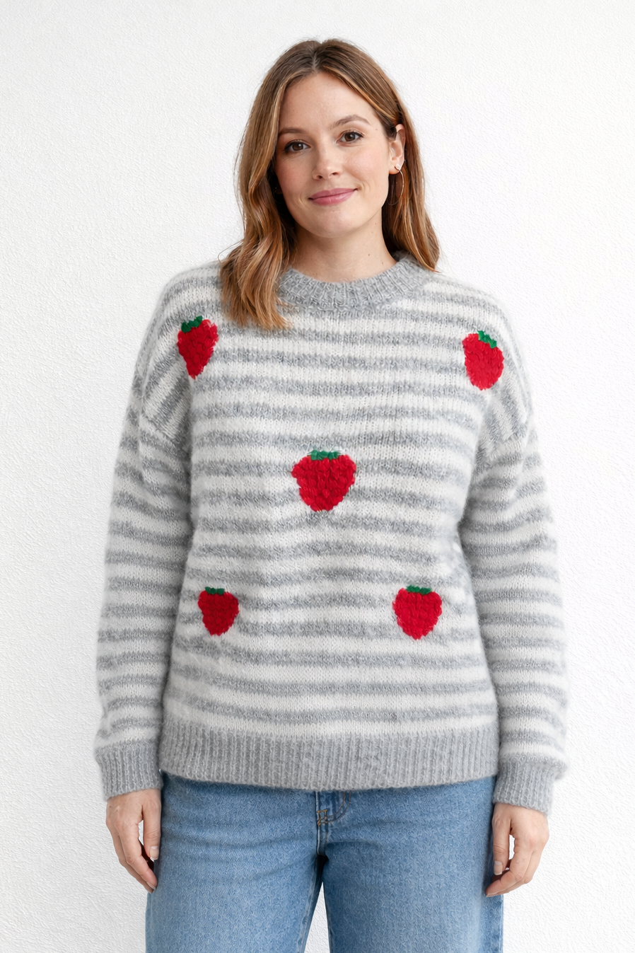 🍓✨ Say hello to this super soft strawberry stripe jumper, it’s the perfect blend of cozy and cute. With its playful strawberry details and chic gray stripes, it's a must-have for your winter wardrobe!Pair it with your favorite jeans for an effortless look