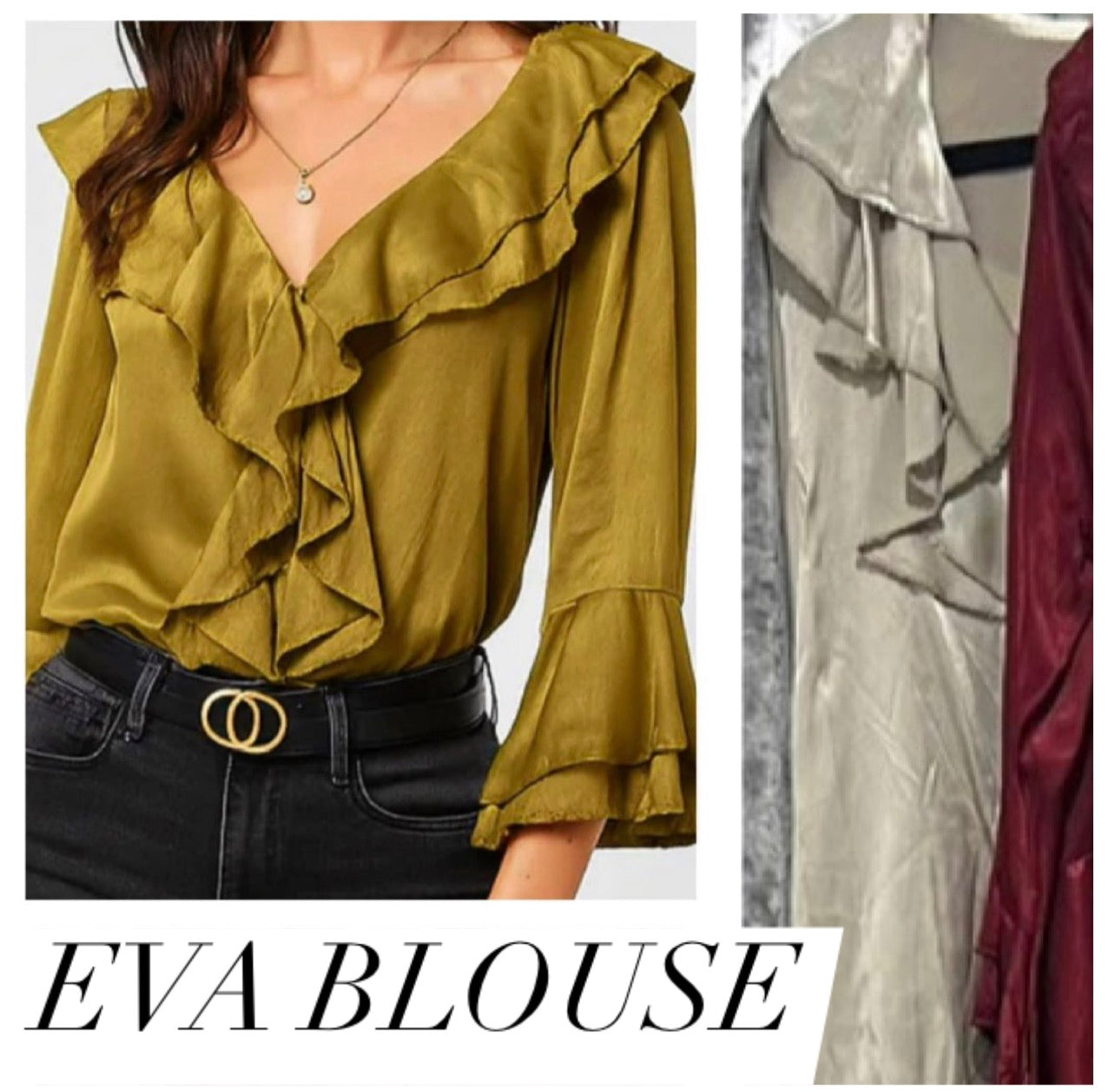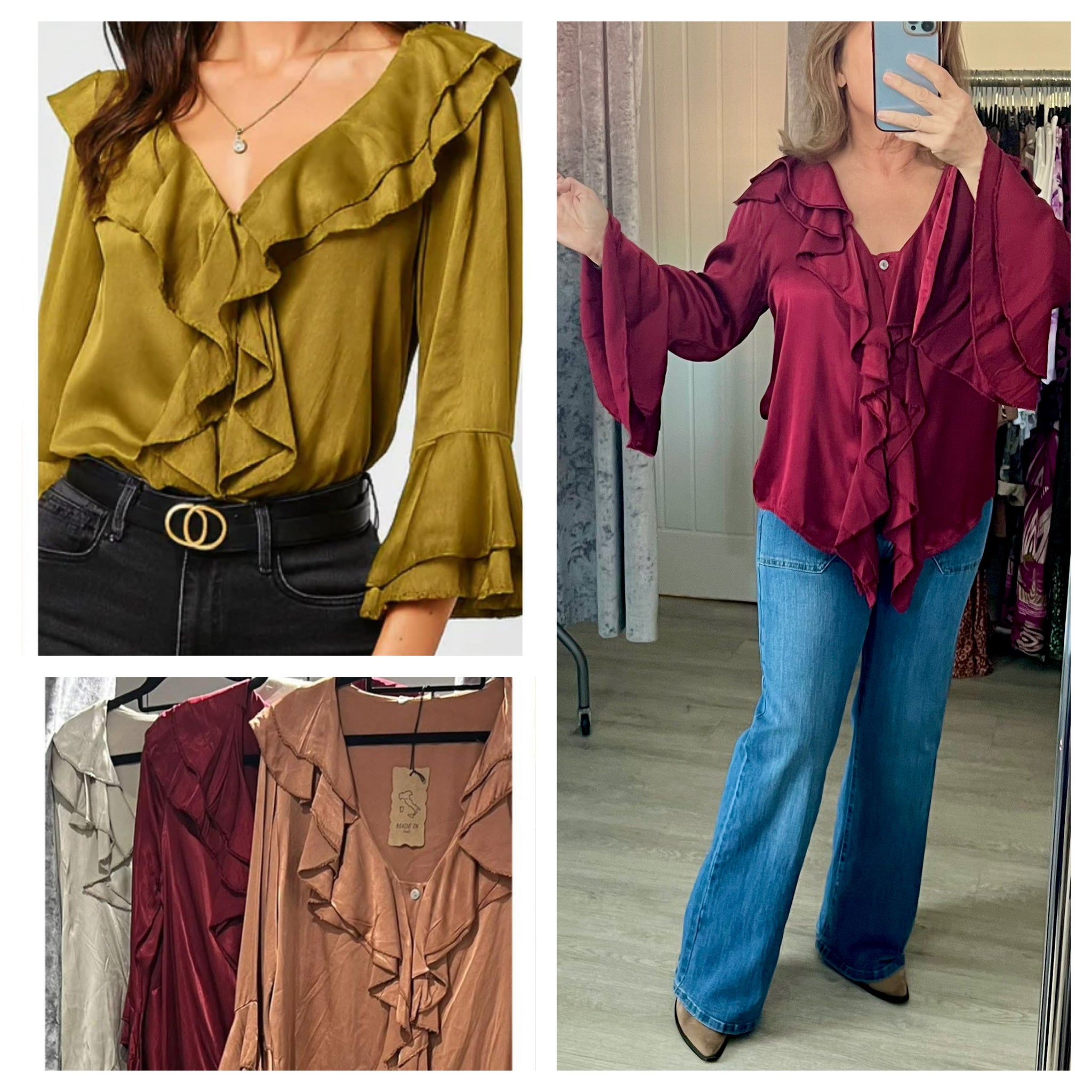 These silky ruffle shirts are with a soft sheen and statement frills that do all the talking. Perfect for dressing up or down. Available in gorgeous shades of bronze, wine & stone