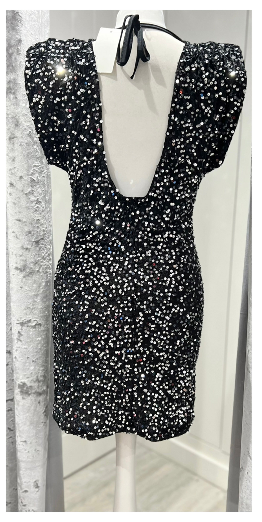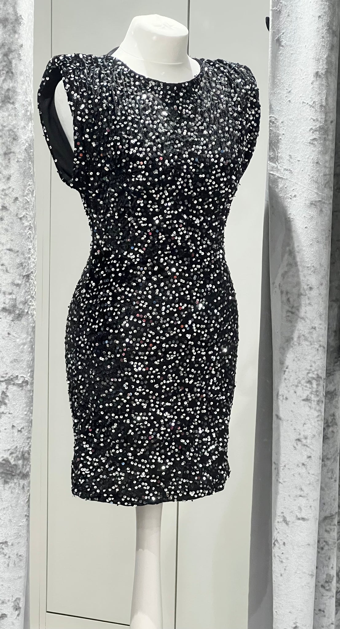 When you’re ready to steal the spotlight let your dress do the talking! Gorgeous fitted with stretch & covered in silver sequins on a velour black background. Small shoulder pads give a fab shape with ruching on shoulders. Zip at lower back.
